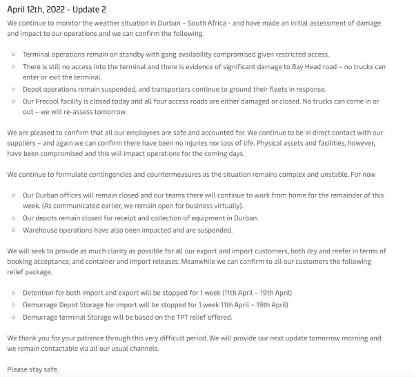 此外,为了缓解德班港运营瘫痪带来的一系列影响,马士基特别向客户推出以下救济方案:免除所有进出口货物一周的柜租费用(4月11-19日);免除所有进出口货物一周的赌场滞期费(4月11-19日);码头存储滞期费将基于提供的 TPT 减免。