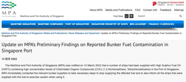 MPA在周三的一份电子邮件声明称,其在3月14日首次意识到燃油污染问题,多艘船舶接收的高硫燃料油 (HSFO)中含有高浓度的氯化有机化合物 (COC)(1,2-二氯乙烷,四氯乙烯)。