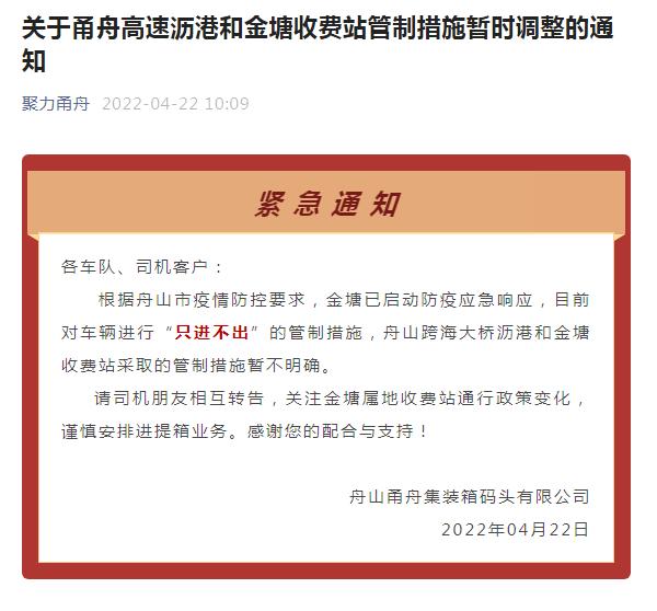 舟山甬舟集装箱码头有限公司最新发布通告称:根据舟山市疫情防控要求,金塘已启动防疫应急响应,目前对车辆进行“只进不出”的管制措施,舟山跨海大桥沥港和金塘收费站采取的管制措施暂不明确。