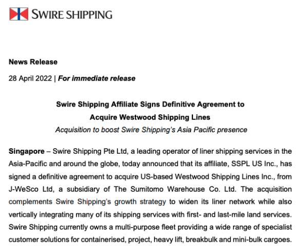 4月28日,全球领先班轮运营商太古航运(Swire Shipping)附属公司SSPL US完成了对美国公司Westwood Shipping Lines的收购。