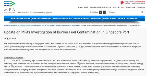 根据新加坡海事及港务管理局(MPA)周四(5月5日)的更新,最近一批在新加坡海销售的受污染船用燃料来源已追溯至一艘在阿联酋装载的油轮。