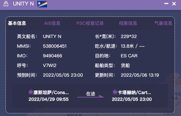 宝船网提供的最新船舶AIS信息显示,该船已驶抵目的地西班牙的卡塔赫纳港。