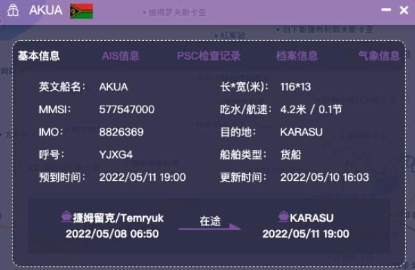 宝船网提供的AIS数据显示,“AKUA”轮4月21日装载了谷物从萨姆松港出发,5月5曰抵达捷姆留克港,原计划5月11日驶抵KARASU港,而截至目前,“AKUA”轮仍停留在捷姆留克港。