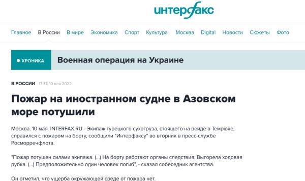 5月10日上午,一艘杂货船亚速海捷姆留克港( Temryuk )水域起火,造成1名船员死亡。