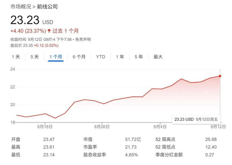 过去一个月,Frontline股价表现亮眼。截至9月12日收盘,公司股价报23.23美元,单月大涨4.40美元,涨幅高达23.37%。在VLCC运价飙升的驱动下,投资者对其盈利预期显著升温,资金面迅速追捧。