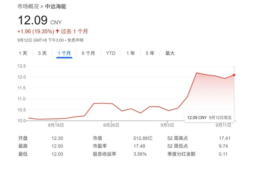 同期,中远海能股价亦大幅走强。截至9月12日收盘,公司股价报12.09元,单月上涨1.96元,涨幅达19.35%。进入9月后,伴随国际原油运输需求回暖及VLCC日租金持续走高,中远海能股价快速突破11元关口,并在9月10日前后触及12.5元高点,创下近一个月新高。