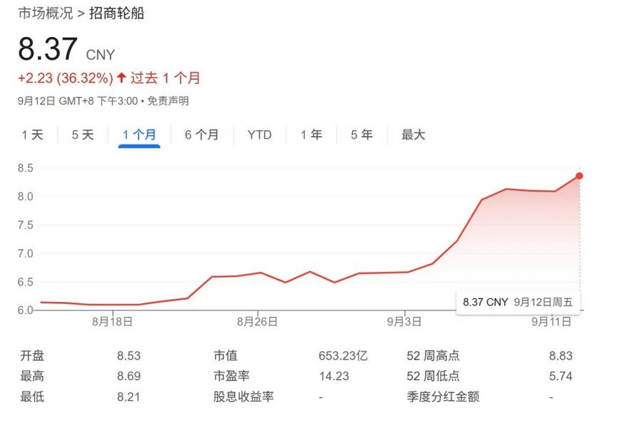 招商轮船的走势更为凌厉。过去一个月,公司股价累计上涨2.23元,至9月12日报收8.37元,单月涨幅高达36.32%,在A股油轮板块中领涨。资金对其运力规模及市场弹性的认可,使招商轮船成为本轮VLCC行情中的最大受益者之一。