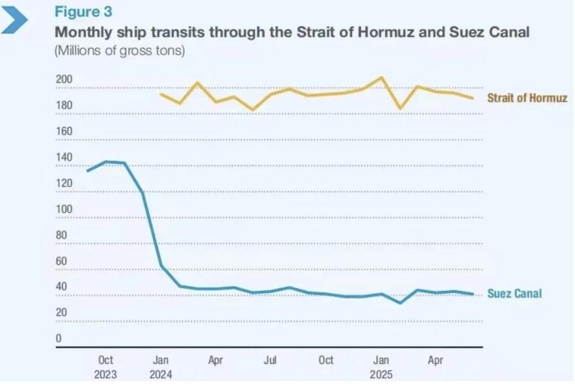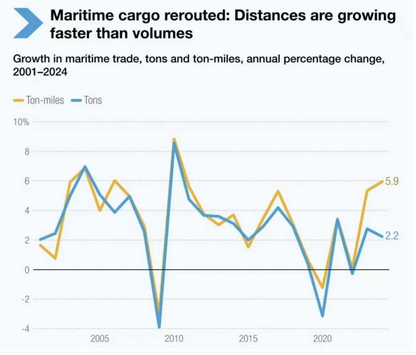 截至2025年5月,过境苏伊士运河的船舶流量比2023年减少约70%,大量船舶被迫改道好望角。2024年全球平均单航程里程增至5,245海里,高于2018年的4,831海里。