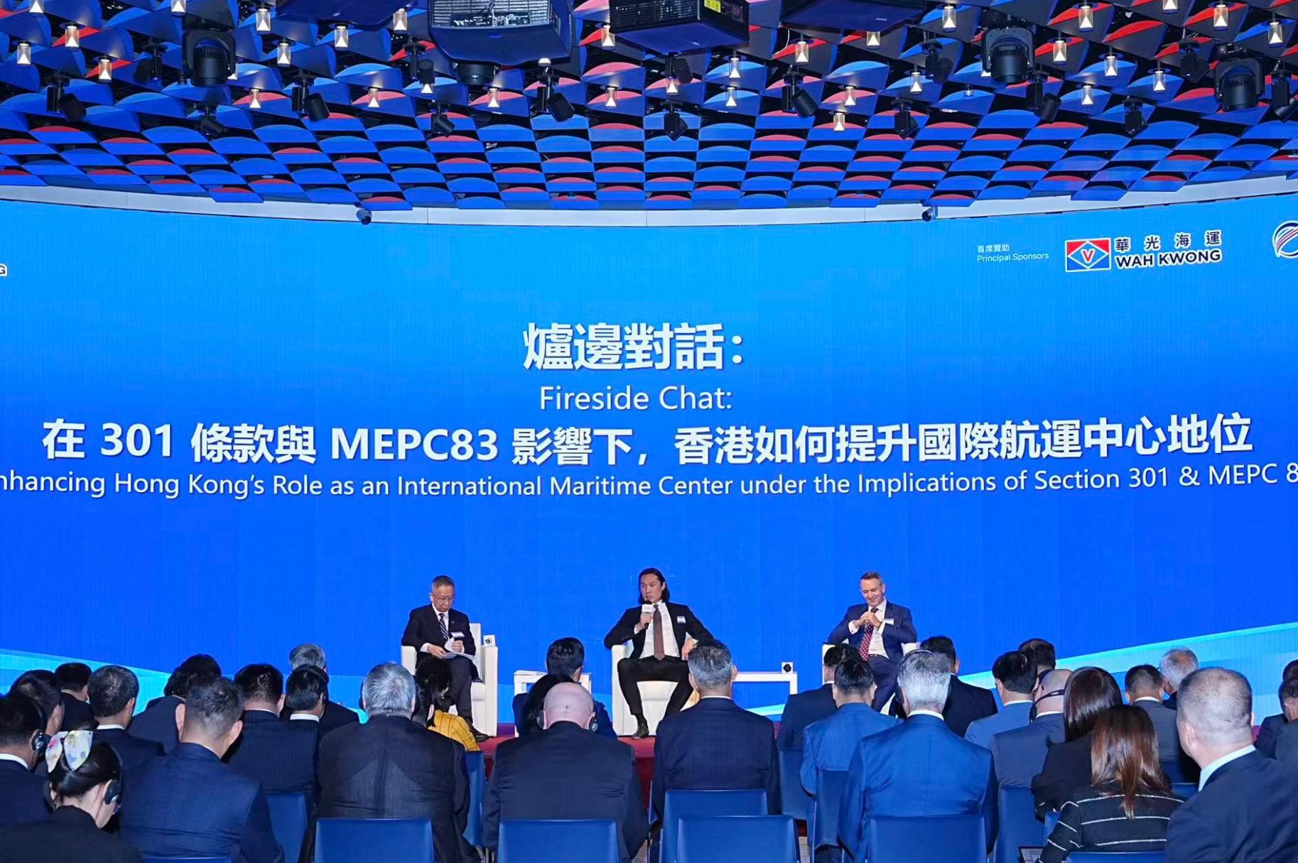 随后的炉边对话环节则由香港船东会内地事务总监冯佳培主持,与谈嘉宾包括总会主席赵式庆以及必维集团高级副总裁、必维船级社亚太暨中国区总裁Alex Gregg-Smith。嘉宾们围绕“在301条款与MEPC83影响下,香港如何提升国际航运中心地位”展开交流,主要聚焦全球地缘政治贸易摩擦和海事脱碳监管转型这两大核心挑战。赵式庆认为,香港应充分把握中国在绿色燃料产能方面的优势,打造国际绿色燃料集散中心,加强与大湾区城市的分工协作。他还强调,香港必须主动融入国家发展大局,紧扣“十四五”规划和海洋强国战略,推动与内地产业链的深度衔接。Alex则强调,香港应把握作为连接内地与全球市场“门户”的独特优势,将自身定位从“门户”转变为“绿色通道”,成为可持续航运的探路者,以及连接中国绿色实践与国际标准的“桥梁建设者”。