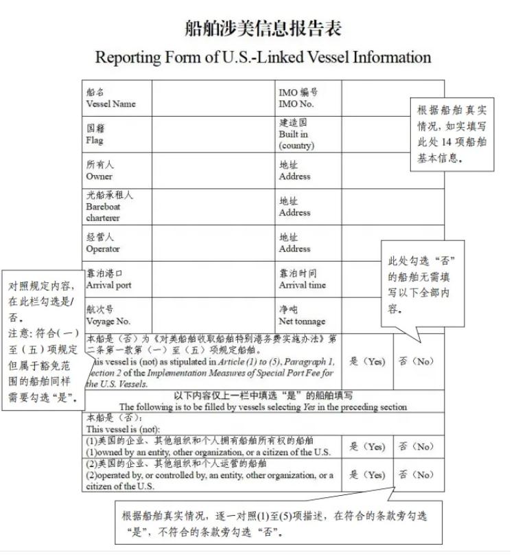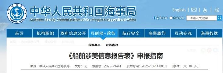 同一时间段,中华人民共和国海事局在官网更新了《船舶涉美信息报告表》申报指南。以下为全文: