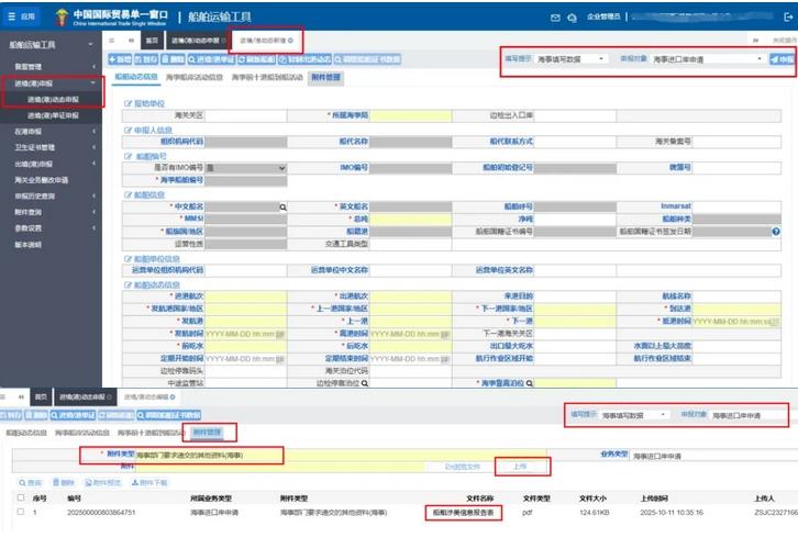 国际贸易“单一窗口”--船舶运输工具--进境(港)动态申报--附件管理