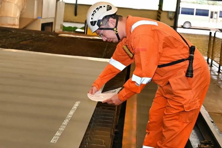 仪式现场,LR船级社验船师甘浩勘验钢板并宣布结果。