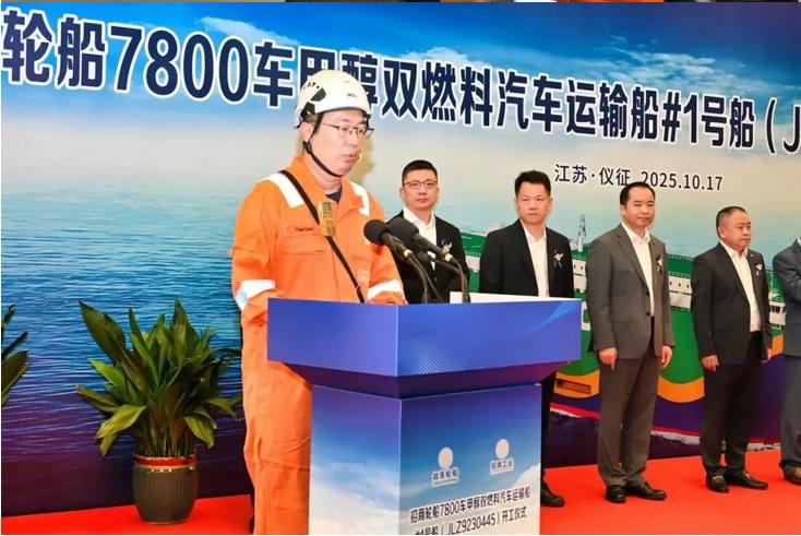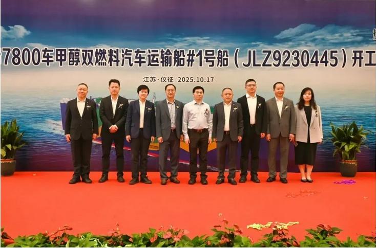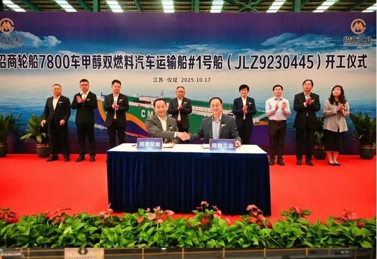 10月17日,招商工业金陵船厂为招商轮船深圳滚装建造的首艘7800车甲醇双燃料汽车运输船在仪征厂区开工,招商轮船深圳滚装总经理刘如松,招商工业金陵船厂总经理江家忠出席活动并致辞。