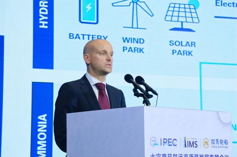 主旨演讲环节,海宏轮船(香港)有限公司总经理刘宏军以《构建新格局下的韧性:全球油运市场的挑战与船队高标准管理》为题发表主旨演讲。他指出,在俄乌冲突、红海局势及OPEC+政策调整等多重因素交织下,全球油运市场的不确定性成为“新常态”。海宏轮船通过数字化管理、智能安全系统、绿色技术与多元运力布局,构建“韧性+敏捷”的运营体系,提升风险抵御与盈利能力。刘宏军呼吁,全行业需共同重视脱碳带来的深远挑战,强化在绿色船舶建造、替代燃料供应链建设等关键技术路径上的协同研发,构建更加紧密的产业伙伴关系。