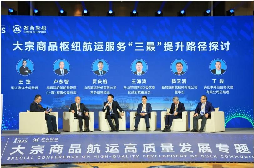 圆桌论坛上,浙江海洋大学教授王捷担任主持,与山东海运集团有限公司常务副总经理贾庆格、泰昌祥船舶管理(上海)有限公司总裁卢永智、新加坡新航船务有限公司执行董事杨天满、舟山市普陀区区委常委、区政府党组成员王海涛、舟山中外运船务代理有限公司总经理丁峻,围绕“大宗商品枢纽港航运服务‘三最’提升路径探讨”话题展开讨论,从资源配置、服务优化、成本控制等维度,为“三最”枢纽港建设提出了诸多切实可行的建议。