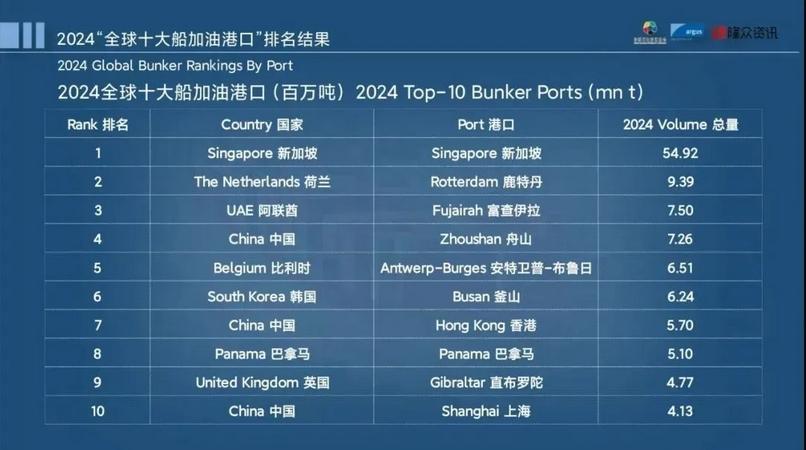 会议现场,行业高度关注的“2024年度全球十大船加油港口”及“全球十大船加油企业”排名发布,新加坡以5492万吨的加注量继续在全球船加油港口中占据领先地位,舟山稳居全球第四,加注量紧追排名第三的富查伊拉,发展势头强劲。加油企业排名同样看点十足,中国船舶燃料有限责任公司增长迅猛,相较于2023年的排名,成功跃升2位,一举升至全球第一,凸显了中国企业在该领域的核心竞争力与快速成长能力。