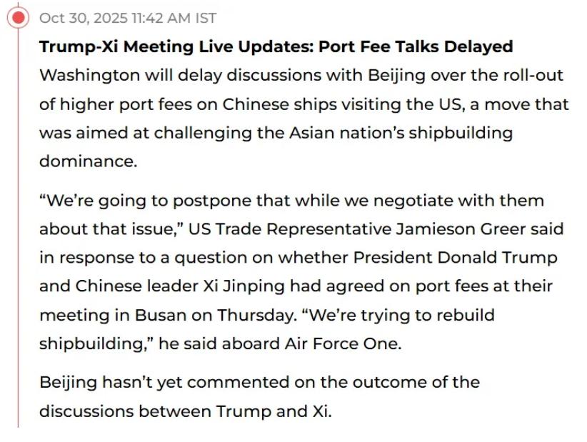 此前CNBC也报道称,美国将推迟与中国就“港口费”的谈判。