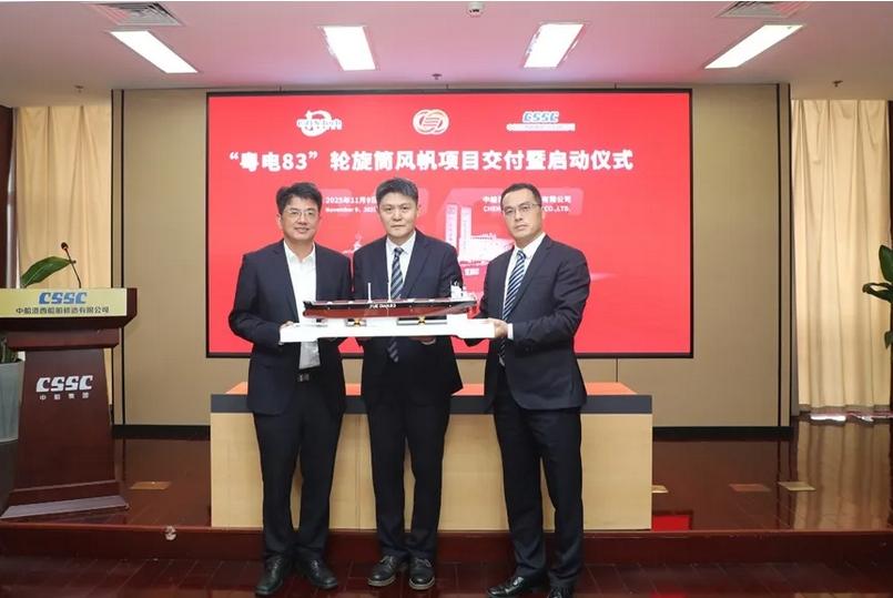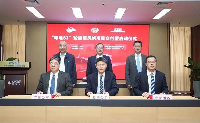 此次交付的旋筒风帆,是中船节能公司在新型船舶节能技术领域的重要突破,其成功应用将为“粤电83”轮降低约10%的燃油消耗,每年减少二氧化碳排放超 1500 吨,为全球航运业绿色发展树立新标杆。