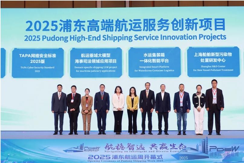 2025年“浦东高端航运服务创新项目”在开幕式正式发布。包括中远海运自主研发的“航运垂域大模型海事司法领域应用项目”、 必晟物流科技的“AI赋能航运全链路智能服务平台”、迈润智能科技的“面向MASS的智能船舶态势感知解决方案”、亚太运输资产保护协会“航运供应链网络安全标准”等。项目均围绕绿色低碳、能源高效利用、数智化转型等展开创新,助力上海国际航运中心建设。