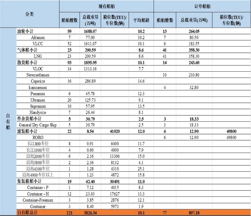 资料显示,截止2025年上半年,招商轮船船队共计拥有自有船221艘,总载重吨3816.34万吨,其中59艘油轮、23艘气体船、93艘散货船、5艘件杂货船、22艘滚装船和19艘集装箱船;租入船68艘,总载重吨356.49万艘,其中42艘散货船、4艘件杂货船和22艘集装箱船。