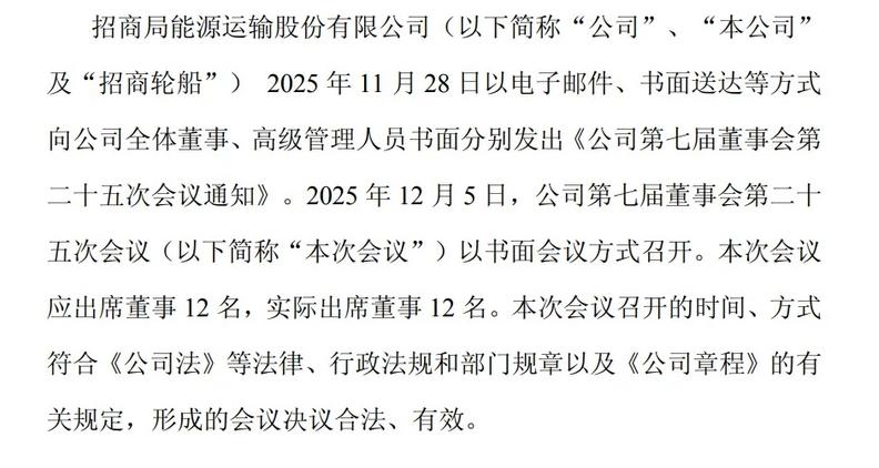 12月5日,招商局能源运输股份有限公司(证券代码:601872,证券简称:招商轮船)发布《第七届董事会第二十五次会议决议公告》。