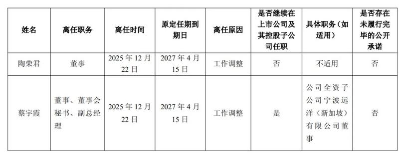 公告称,公司董事会近日收到董事陶荣君先生,董事、董事会秘书、副总经理蔡宇霞女士的书面辞职报告。因工作调整,陶荣君先生申请辞去公司董事职务,辞职后将不在公司及其控股子公司担任任何职务。蔡宇霞女士申请辞去公司董事、董事会秘书、副总经理职务,辞职后将不在公司担任任何职务,但仍将继续担任公司全资子公司宁波远洋(新加坡)有限公司董事职务。