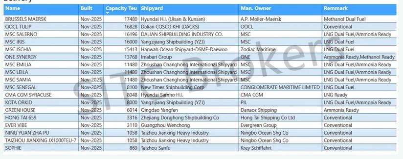 2025 年 11 月完成 18 艘船舶交付。从船型分布来看,万箱级(10,000 TEU 及以上)船舶占比达 50%,成为本月交付的核心船型;从动力配置来看,双燃料动力船舶及预留燃料升级空间的船舶占比已攀升至三分之二,反映出航运业在绿色低碳转型背景下,新造船动力配置的主流趋势。