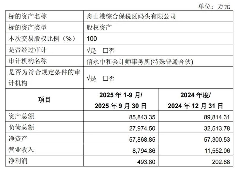 资料显示,综保区码头地处舟山海域关键节点,紧邻长江入海口,系衔接沿海与长江流域航运的重要枢纽,主要经营业务为在港区内从事散货、件杂货、集装箱装卸业务。标的公司现有 3 万吨级(兼靠5 万吨级)泊位和5万吨级(兼靠 7 万吨级)泊位各一座,码头岸线总长632 米,前沿水深可达-15.4 米,总占地面积约 34 万平方米,配套110 吨门座式起重机、41 吨集装箱岸桥等专业装卸设备。综保区码头2024 年和2025年1-9 月完成吞吐量分别为 415.02 万吨和364.84 万吨。