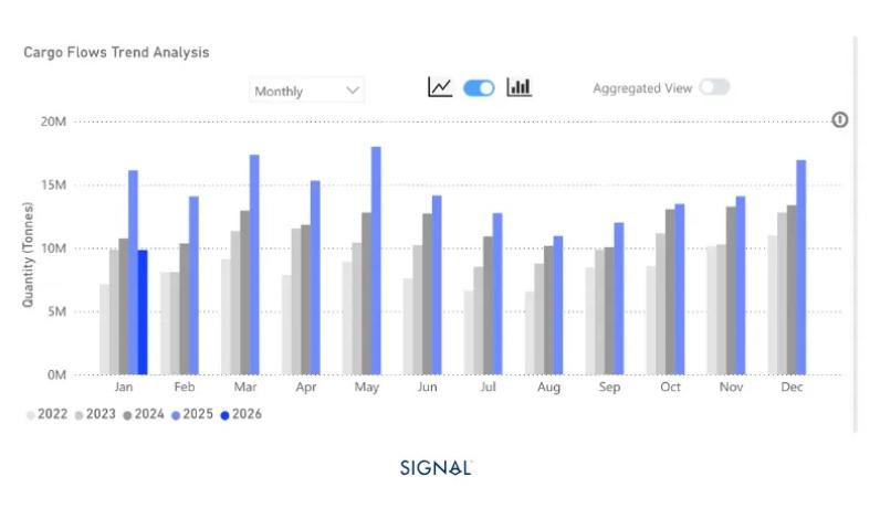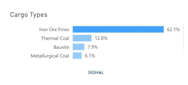 2025年,几内亚铝土矿出口继续保持强劲增长势头。Signal Group数据显示,今年以来几内亚铝土矿出口量实现连续同比增长,预计全年出口总量将达到约1.75亿吨,较2024年大幅增长22%。在干散货运输市场中,铝土矿已成为仅次于铁矿石的第二大海岬型船吨海里贡献货种。
