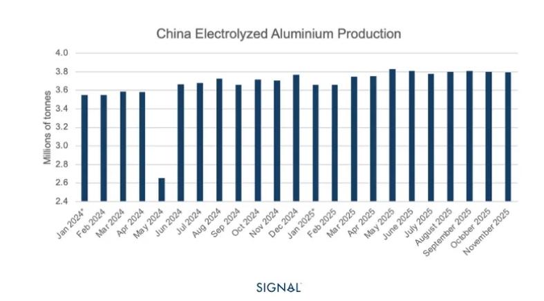 需求端方面,中国仍是全球铝土矿贸易的“压舱石”。2025年,中国消耗了全球约86%的铝土矿出口量,为庞大的铝工业体系提供原料支撑。需要关注的是,中国自2017年起对原铝产量实施年产4500万吨的上限管理。官方数据显示,2025年前11个月中国原铝产量已达4140万吨,意味着12月单月产量空间明显受限,低于此前的月均水平。