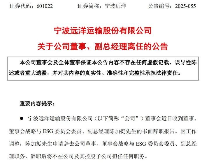 12月25日晚间,宁波远洋运输股份有限公司(证券代码:601022,证券简称:宁波远洋)发布《关于公司董事、副总经理离任的公告》。