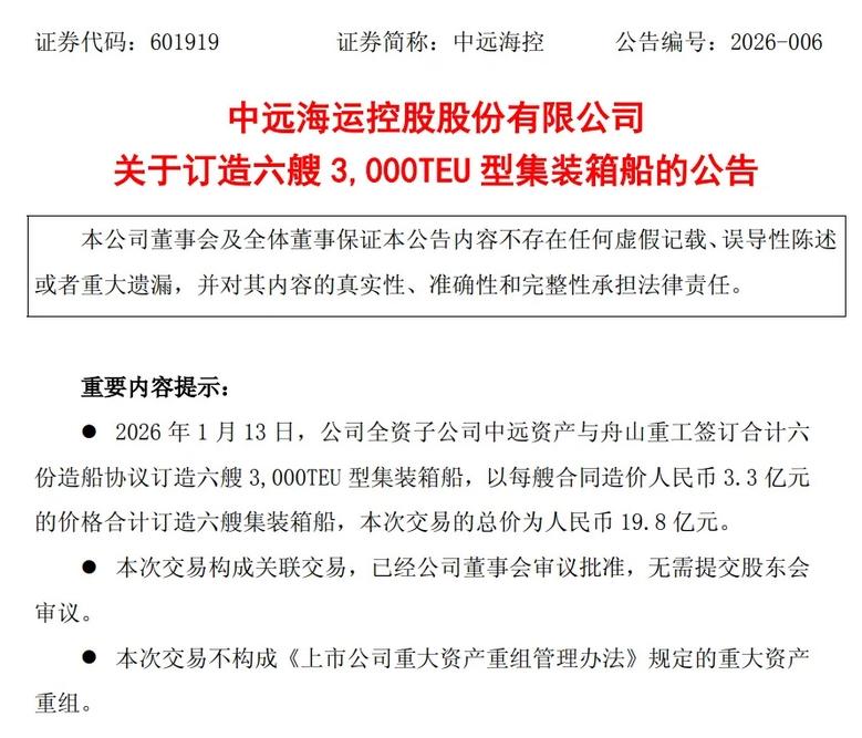 同日,中远海控公告称,公司全资子公司中远资产管理有限公司(简称“中远资产”)向舟山中远海运重工有限公司(简称“舟山重工”、)订造合计六艘 3,000TEU 新型宽体常规燃料动力集装箱船,每艘人民币3.3亿元,交易总价为人民币 19.8 亿元,计划于 2028 年 6 月至 12 月期间陆续交付。