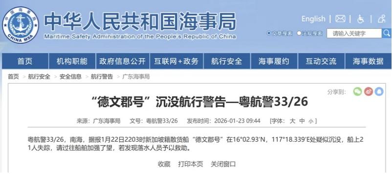据广东海事局发布的粤航警33/26公告,涉事货船为新加坡籍散货船“德文郡号”(DEVON BAY)。公告称,据报1月22日2203时新加坡籍散货船“德文郡号”在16°02.93′N,117°18.339′E处疑似沉没,船上21人失踪,请过往船舶加强了望,若发现落水人员予以救助。