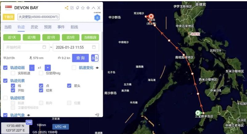中远海科旗下船视宝为海运圈聚焦提供的船舶AIS信息显示,“德文郡号”(IMO:9622849)船长190米,宽32.3米,载重吨56095吨,于1月20日从菲律宾三宝颜港(ZAMBOANGA)出发。
