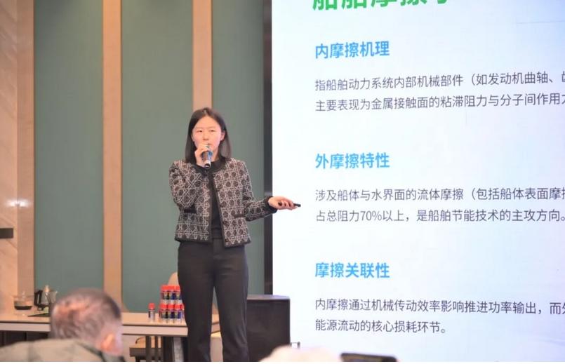 上海碳之道节能环保科技有限公司张新星围绕“鲸刚鑫®船舶动力增效剂”系统讲解其技术机理与减排效果。在CII、EU ETS等监管压力不断加大的背景下,他从纳米材料的“滚球轴承效应”“抛光效应”与“自修复”机理出发,结合实船数据展示其在降低内摩擦、节约燃油和延长设备寿命方面的实际成效,并给出了清晰的投资回报周期测算模型。