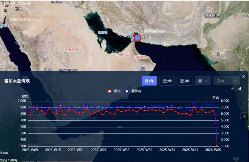 从实际航运运行层面看,当前紧张局势尚未对通航秩序造成实质性冲击。中远海科旗下船视宝追踪数据显示,2026年第五周(1月26日至2月1日),霍尔木兹海峡共计通过船舶850艘,合计载重吨约7376万吨,较前一周的829艘、7546万吨有所上升,整体保持平稳运行态势。