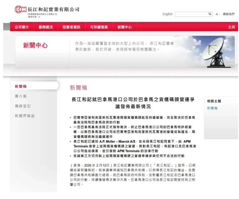 2月12日,长江和记公告称,已根据投资保护条约,就争议事项通知巴拿马共和国,以保障长江和记的权益,并邀请巴拿马共和国进行磋商,就巴拿马政府所采取并影响长江和记及巴拿马港口公司的行动,持续积极寻求解决方案。巴拿马港口公司为长江和记间接持有之附属公司。