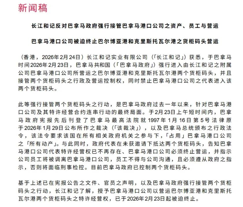 公司披露,巴拿马政府代表在未获邀请情况下进入两个集装箱码头,告知巴拿马港口公司代表特许经营权已不再存在、必须终止营运,并指示公司员工将被调离巴拿马港口公司,员工不得与公司沟通,且必须遵从政府的指示,否则将面临刑事检控。目前两座码头已由政府控制。