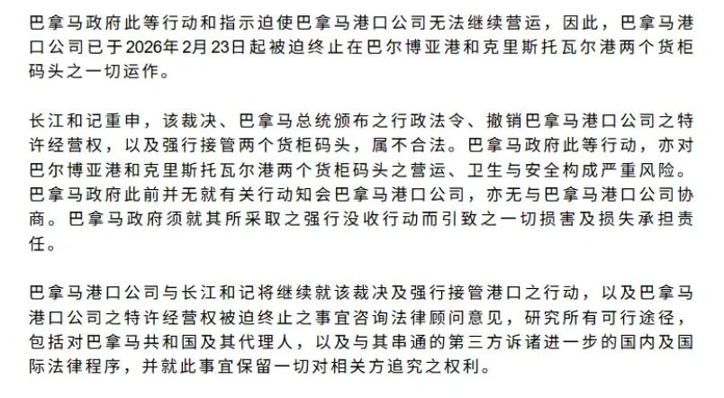 长和强调,巴拿马港口公司与长和将继续就上述裁决及巴拿马政府强行接管港口的行动,以及巴拿马港口公司特许经营权被迫终止事宜咨询法律顾问意见,研究所有可行途径,包括对巴拿马及其代理人,以及与其串通的第三方诉诸进一步的国内及国际法律程序,并就此事宜保留一切对相关方追究的权利。