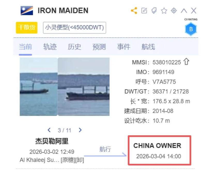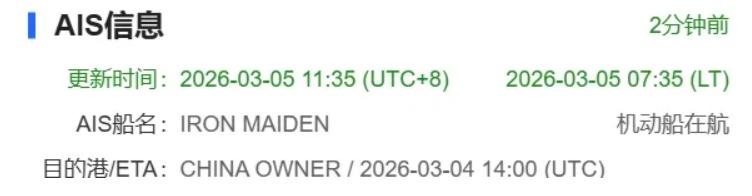 值得注意的是,与3月4日穿越霍尔木兹海峡的苏伊士型油轮“Pola”轮不同,“Iron Maiden”轮在整个航行过程中始终开启AIS信号,并在船舶目的地信息中显著标注“中国船东”。