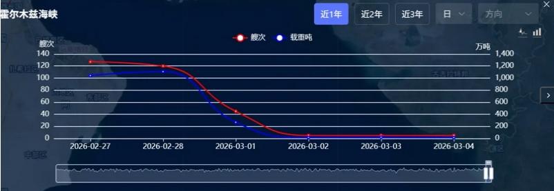 船视宝统计显示,自2月28日以来,霍尔木兹海峡船舶通过数量显著下降。3月2日至4日期间,每日仅有5艘船舶通过该水道,且合计载重吨不超过21万吨,远低于正常时期水平。