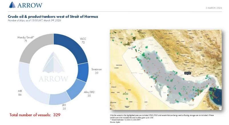与此同时,大量油轮仍滞留在中东海湾水域。船舶经纪商Arrow最新数据显示,目前共有329艘原油和成品油轮因局势紧张而无法通过霍尔木兹海峡,其中包括72艘超大型油轮(VLCC),约占全球VLCC运力的8%。这些船舶事实上已阶段性退出市场贸易船队。
