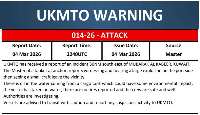 一艘在锚地停泊的油轮船长报告称,其在船舶左舷方向看到并听到一次巨大爆炸,随后目击到一艘小型船只迅速驶离事发海域。目前该船一处货油舱出现原油泄漏,海面已发现油污,可能对环境造成一定影响。与此同时,船舶已出现进水情况,但暂未报告发生火灾,船员均安全无恙。