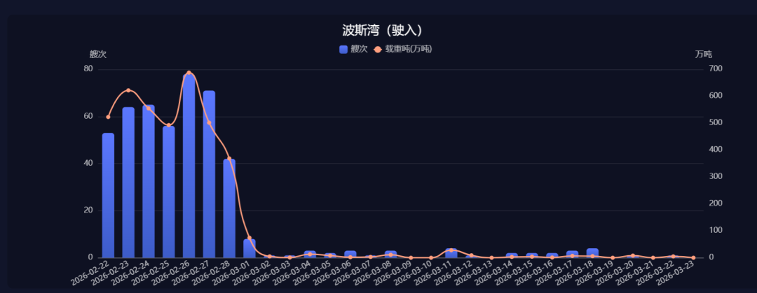 从航运流量数据来看,区域通航已明显承压。中远海科旗下船视宝数据显示,3月22日波斯湾船舶通行总量仅为5艘次,其中集装箱船1艘、原油船1艘,其余为其他类型船舶3艘;当日驶入1艘次、驶出4艘次,整体流动性处于极低水平。