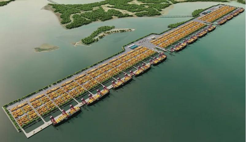 根据规划,该港口一期设计吞吐能力将在2030年前达到约480万TEU,并在2047年前逐步提升至约1690万TEU,远期规划仍预留进一步扩张空间。首期工程将建设最多4个泊位,可接靠最大24000TEU级超大型集装箱船;远期则计划扩展至13个泊位,总岸线长度约7.5公里。