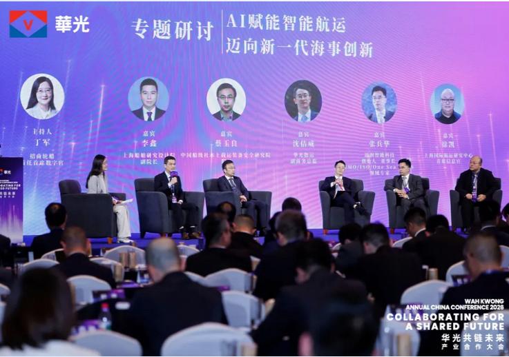 “AI赋能智能航运:迈向新一代海事创新”专题研讨,由招商轮船首任首席数字官丁军女士主持。上海船舶研究设计院副院长李鑫先生,中国船级社水上载运装备安全研究院院长蔡玉良先生,华光散运副商务总监沈佶威先生,迈润智能科技(上海)有限公司创始人、董事长张兵华先生,与上海国际航运研究中心首席信息官徐凯先生参与讨论