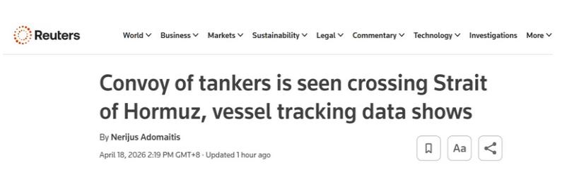 多位不愿具名的船东人士向记者透露,目前正密切评估停火期的通行风险,计划利用这一窗口期加速撤离船舶,以降低后续局势恶化带来的不确定性风险。航运监测数据也印证了这一趋势:船视宝数据显示,截至4月18日15时的近一天内,已有20艘船只通过霍尔木兹海峡,较4月17日的16艘次有所上升。