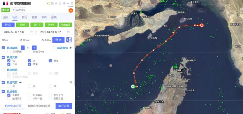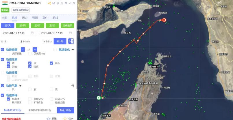 此外,达飞集团旗下多艘集装箱船也在行动中,其中“CMA CGM EVERGLADE”轮(载箱量15254TEU)、“CMA CGM MANAUS”轮(载箱量2556TEU)正处于海峡通行过程中,“CMA CGM GALAPAGOS”轮(载箱量15254TEU)、“CMA CGM DIAMOND”轮(载箱量3534TEU)则正朝海峡方向航行,准备驶离海湾。