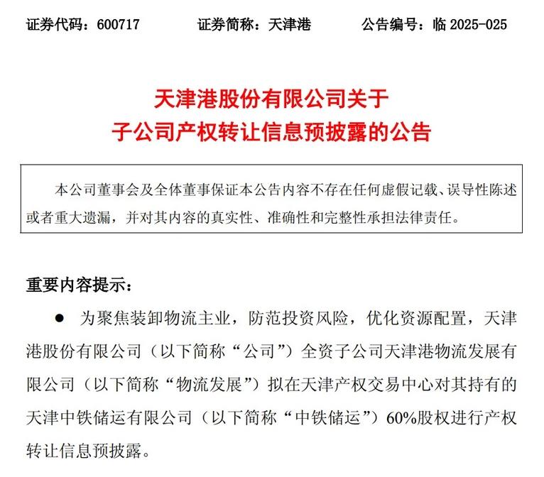 天津港(600717)10月22日晚间公告,为聚焦装卸物流主业,防范投资风险,优化资源配置,公司全资子公司天津港物流发展有限公司(下称“物流发展”)拟在天津产权交易中心对其持有的天津中铁储运有限公司(下称“中铁储运”)60%股权进行产权转让信息预披露。