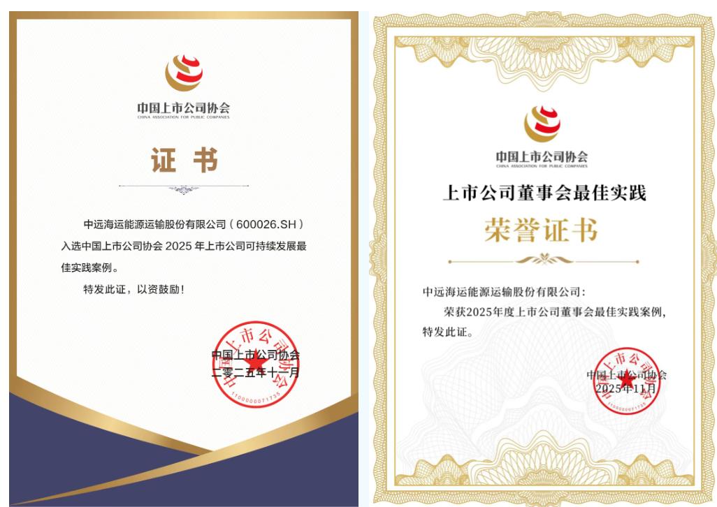 中远海能荣获2025年度上市公司董事会最佳实践、可持续发展最佳实践案例两项荣誉!
